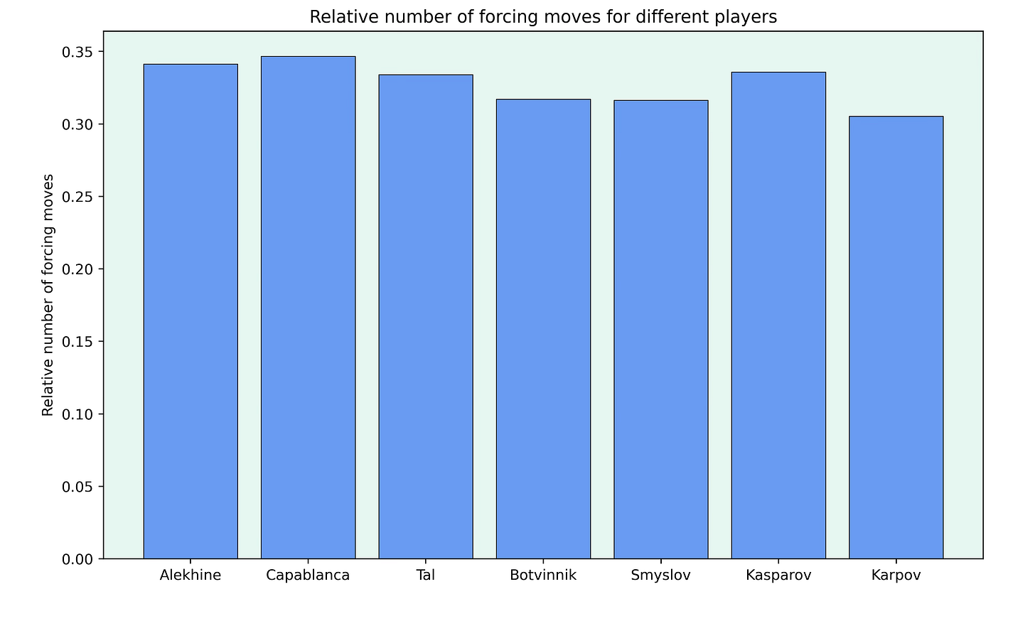 Now that we have a way to identify forcing moves, we can look at the relative number of forcing moves different players play.