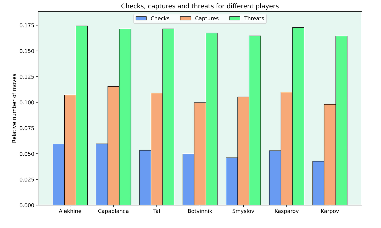 It’s interesting to see that most of the forcing moves are threats, especially since there are more types of threats which I didn’t count. But there is not one type of forcing move that is more commonly played by attacking players compared to more positional players. The relative number of checks, captures and threats reduces evenly for the more positional players.