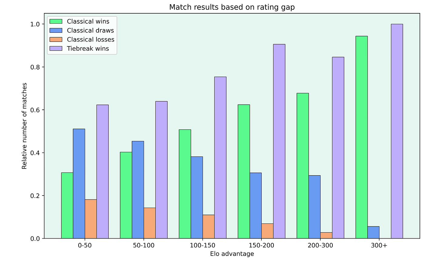 I also took a look at all matches where a player rated at least 100 points below their opponent won. Around 45.5% of these upsets are won in the tiebreaks and only 19% of the upset matches are won by drawing the first classical game and winning the second one. The remaining 35.5% are matches where the underdog won the first game and won or drew the second game.
